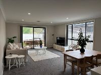 At the heart of the home is a warm living area that flows effortlessly into a fully equipped kitchen. The kitchen is ideal for meal preparation. The bright lounge room benefits from excellent airflow, creating a fresh and inviting atmosphere. Additionally, there is a covered outdoor seating area, perfect for entertaining friends or guests.