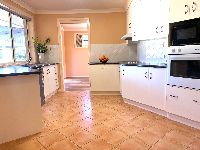 -An open-plan kitchen with a side bench, ideal for meal preparation.