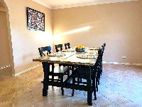 -A dining area with wide windows, allow natural light to flood in, creating a warm, welcoming at atmosphere.
